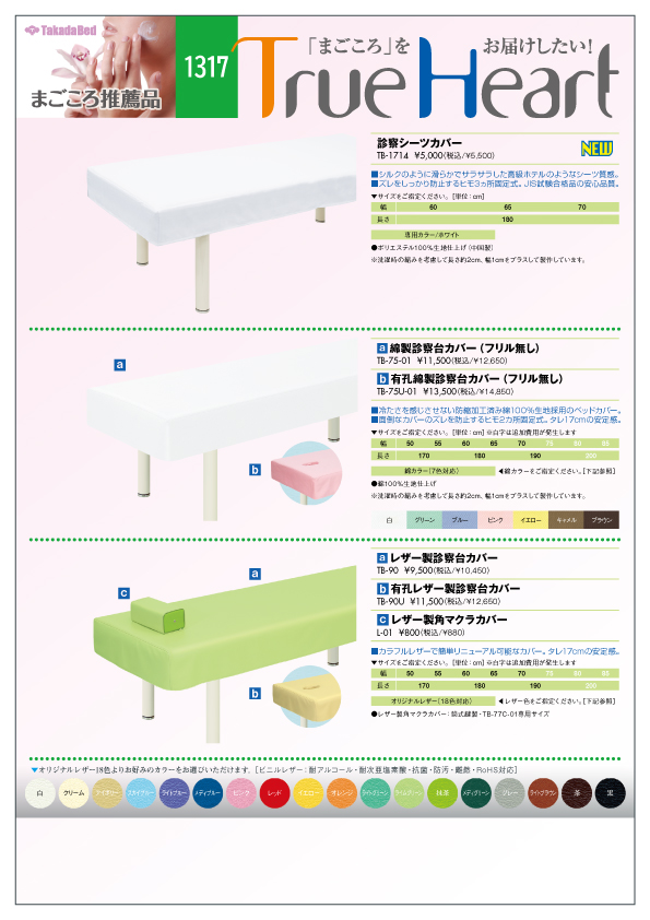 2025年10月1日 / 最終更新日時 : 2025年10月1日 高田ベッドからのお知らせ 新製品案内にまごころ推薦品1317追加 ■掲載製品 TB-1714 診察シーツカバー TB-75-01 綿製診察台カバー(フリル無し) TB-75U-01 有孔綿製診察台カバー(フリル無し) TB-90 レザー製診察台カバー TB-90U 有孔レザー製診察台カバー L-01 レザー製角マクラカバー 高田ベッドからのお知らせ前の記事新製品案内にまごころ推薦品1321追加2025年9月25日 MENUトップページ 製品案内 企業案内 販売店の皆様 お問い合わせ 製品特定について お知らせ 採用情報 PAGE TOP