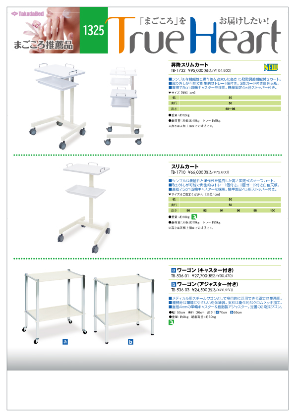 TB-1710 スリムカート ■シンプルな機能性と操作性を追究した高さ固定式のナースカート。 ■取り外しが可能で衛生的なトレー1個付き。3面ガード付き白色天板。 ■直径7.5cm双輪キャスターを採用。簡単固定4ヵ所ストッパー付き。 |