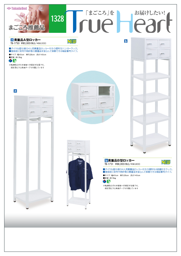 TB-1730 貴重品A型ロッカー ■ダイヤル錠仕様の4人用貴重品ロッカー付きの便利なハンガーラック。 ■施術前に財布や時計等の貴重品を安心して保管できる暗証番号タイプ。 TB-1731 貴重品B型ロッカー ■ダイヤル錠仕様の4人用貴重品ロッカー付きの便利な4段棚付きラック。 ■施術前に財布や時計等の貴重品を安心して保管できる暗証番号タイプ。 |